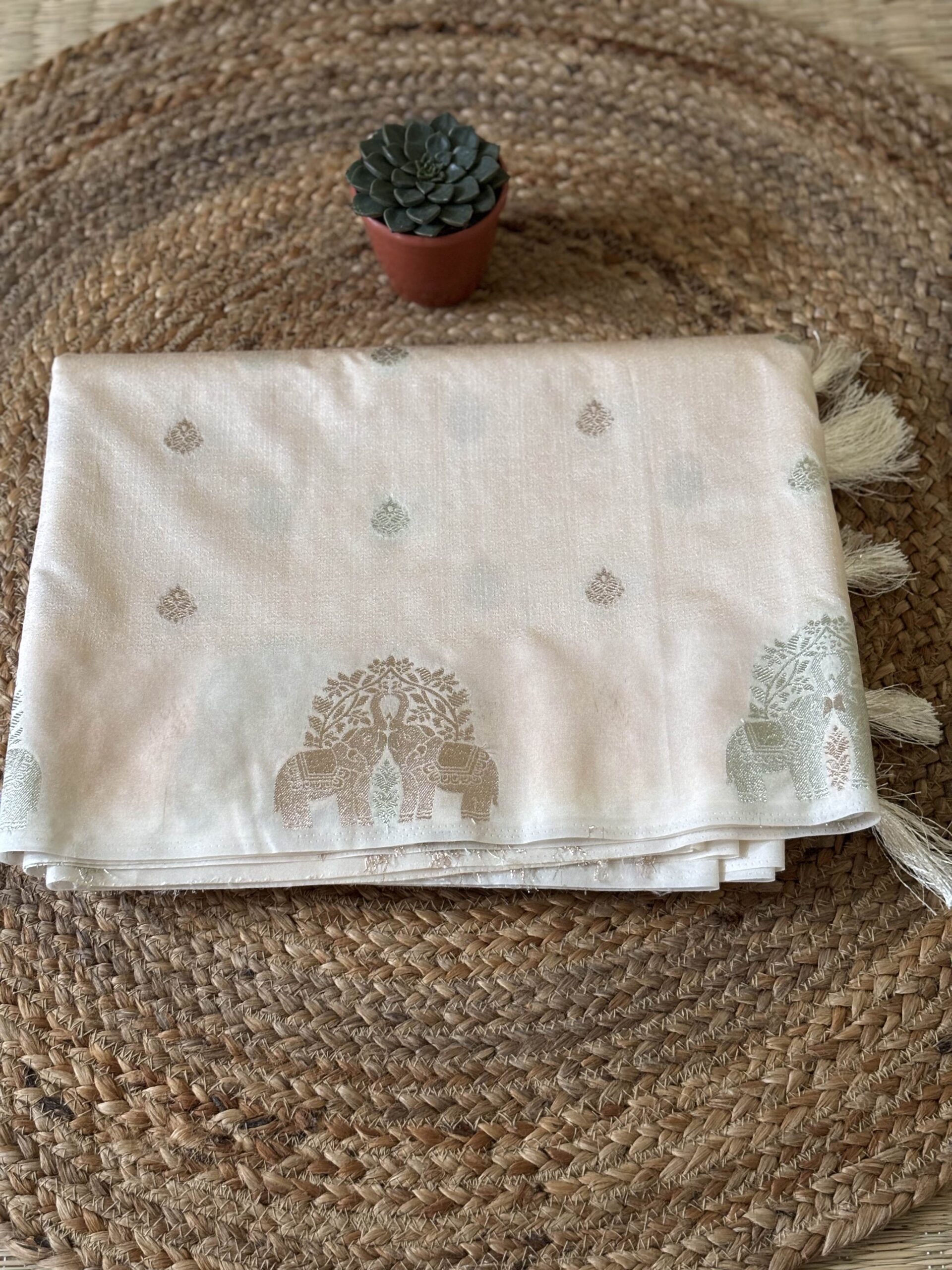 Experience timeless elegance with our Matka Silk Saree adorned with traditional elephant motifs, a perfect blend of heritage and modern grace. Handwoven from fine Matka silk, this saree showcases a rich texture with a natural sheen that reflects understated luxury.